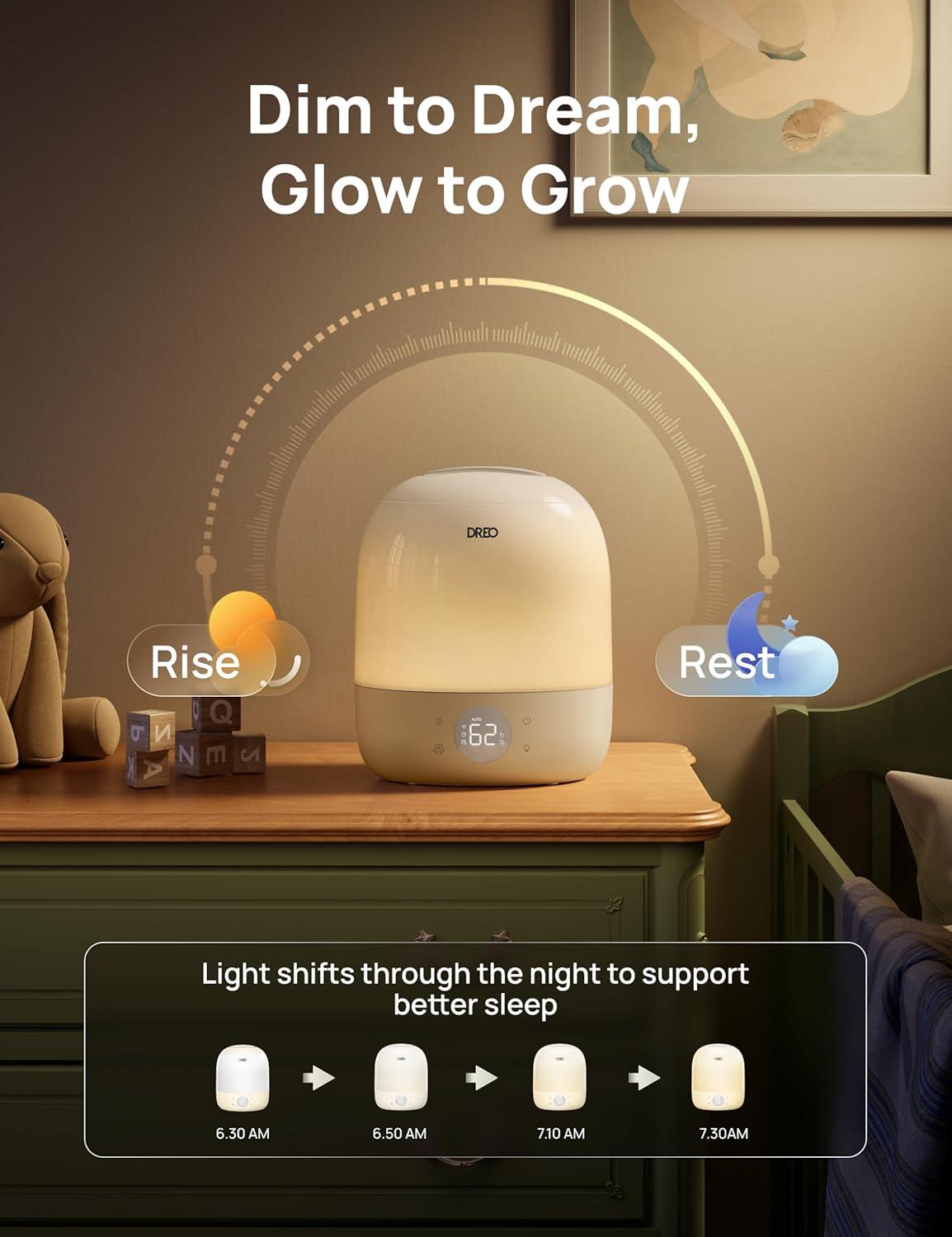 𝙏𝙧𝙖𝙞𝙣 𝘽𝙖𝙗𝙮’𝙨 𝙎𝙡𝙚𝙚𝙥 𝙍𝙤𝙪𝙩𝙞𝙣𝙚: This baby humidifier uses light cues-dimming at night, brightening in the morning-to guide babies toward healthy and consistent sleep habits.