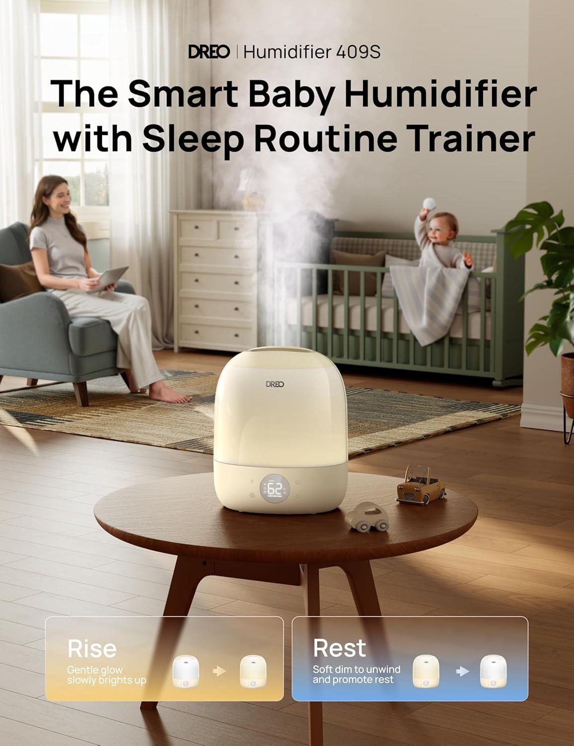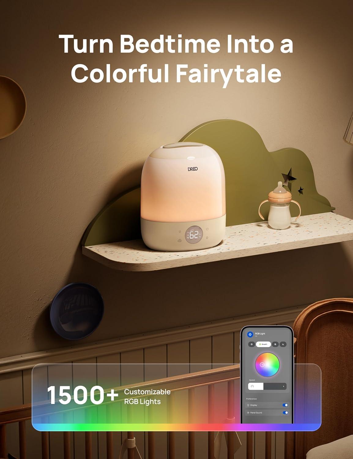 DREO Smart Humidifiers for Bedroom Baby HM409S, 1500+ RGB Night Light & Sleep Routine Trainer, Ultra Quiet 28dB & 3L Top Fill Cool Mist Humidifier for Nursery, Air humidifier for Plants Indoor(White)