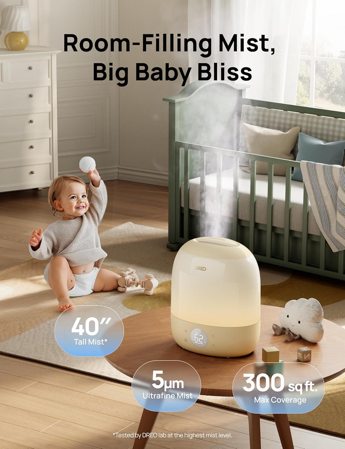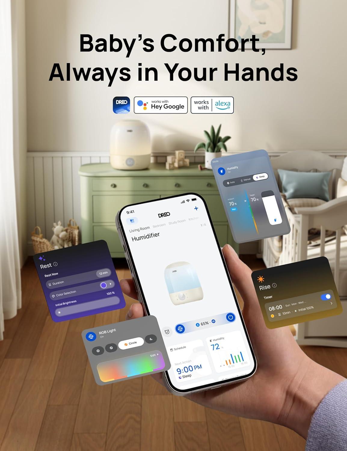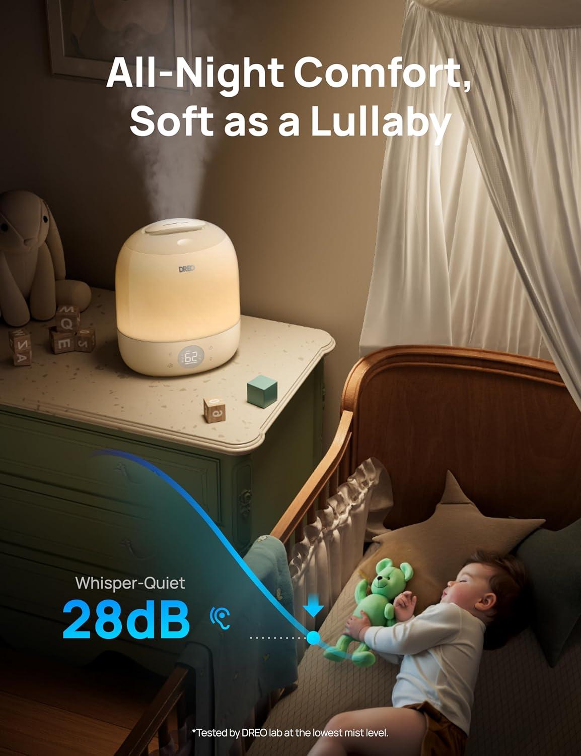 𝘼 𝙁𝙪𝙡𝙡 𝙉𝙞𝙜𝙝𝙩 𝙤𝙛 𝙍𝙚𝙨𝙩𝙛𝙪𝙡 𝙎𝙡𝙚𝙚𝙥: 28dB whisper-quiet performance is ideal for baby and nursery, and you can monitor and adjust humidity remotely via the DREO app or Alexa voice commands to avoid late-night visits.